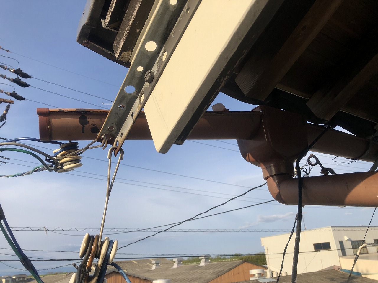 屋根軒は茶系、壁サイディングは白系なので、それぞれに合わせて樋の色も横樋は茶色、縦樋は白色を取付けました。